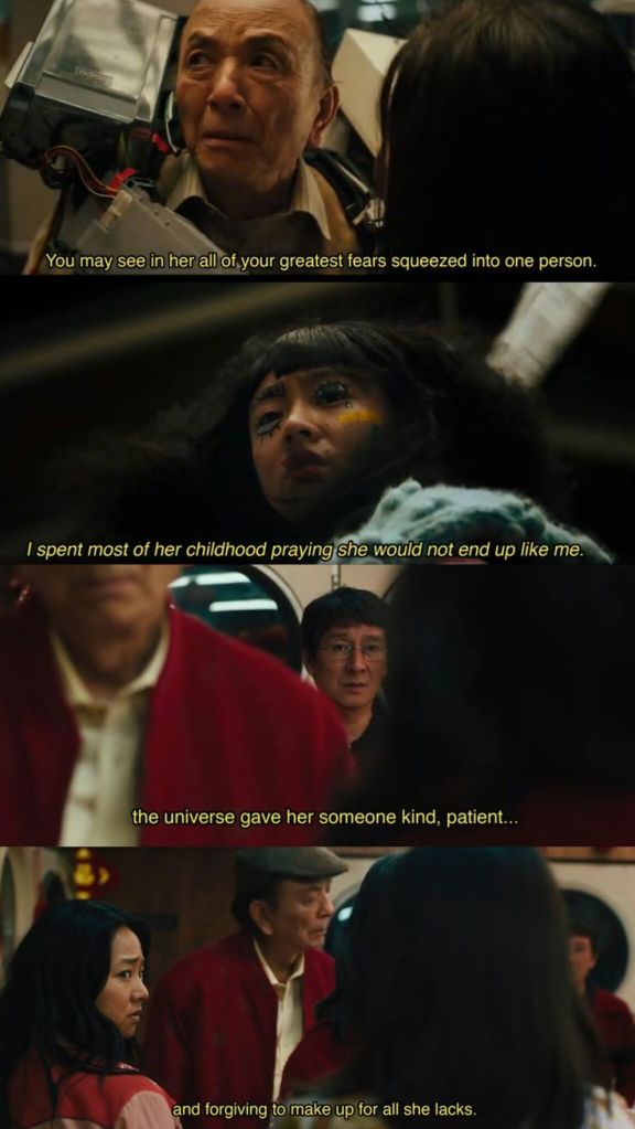Durante toda la trama vamos a ir entendiendo un poco sobre estas relaciones familiares conflictivas, mientras nos introducen al concepto sobre los multiversos que se crean con cada decisión que tomamos en nuestra vida y cómo la protagonista en uno de estos multiversos ha podido descubrir la forma de trasladar su mente a estos universos paralelos y tomar de ellos las habilidades que ha adquirido en cada uno. Igualmente, descubrimos cómo ha surgido Jobu Tupaki, la versión Alphaverso de su hija Joy, cuya mente se dividió después de que Alpha-Evelyn la empujara a saltar extensamente.